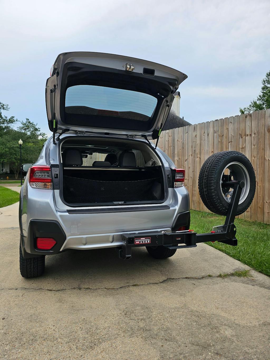 Hitchgate Solo Standard UHG32130 sits at hitch height and is 25″ wide on the support arm. If your hitch is near your rear hatch, probably a good choice.