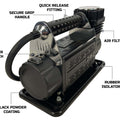 The EGOI high-performance air compressor puts out 5.6 CFM, one of the most powerful portable systems today. The output this system puts out can handle the smallest jobs to the biggest with no problem. The sheer volume of air that this system puts out makes tire inflation quick and easy. Designed for the off-roader in mind, this system can work on bikes, boats, trailers, and RV tires as well.