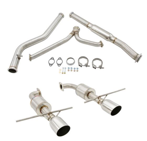 The catback system includes a midpipe and an axleback exhaust for a complete package ready for bolt-up installation to your vehicle with no cutting or welding required, a definite perk!