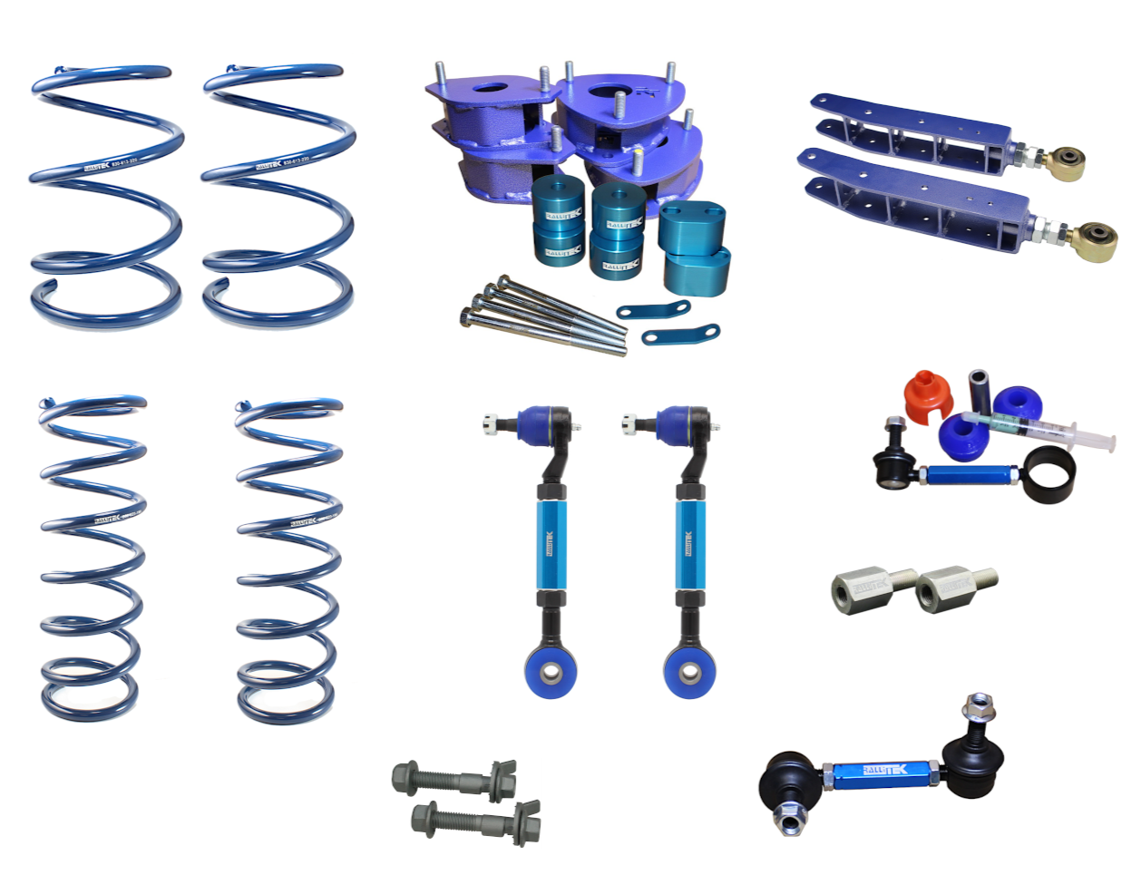 The RalliTEK 3” lift kit features either RalliTEK Subframe Drop Spacers or RalliTEK adjustable rear control arms for camber correction after the lift. Factory front arms are adjustable from the factory and do not need to be replaced. When lifting any car over an inch it’s also essential to consider sway bar geometry. With RalliTEK adjustable end links the factory bar geometry can be retained. In order to keep body roll under control RalliTEK pairs this kit with RalliTEK springs. The spring rates are slightly stiffer than the factory spring rates to counteract the elevated center of gravity due to the lift.
